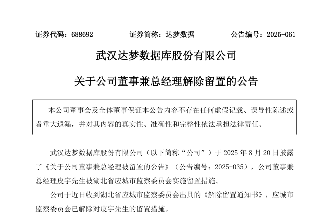 达梦数据(688692)高管被留置一事迎来最新进展。