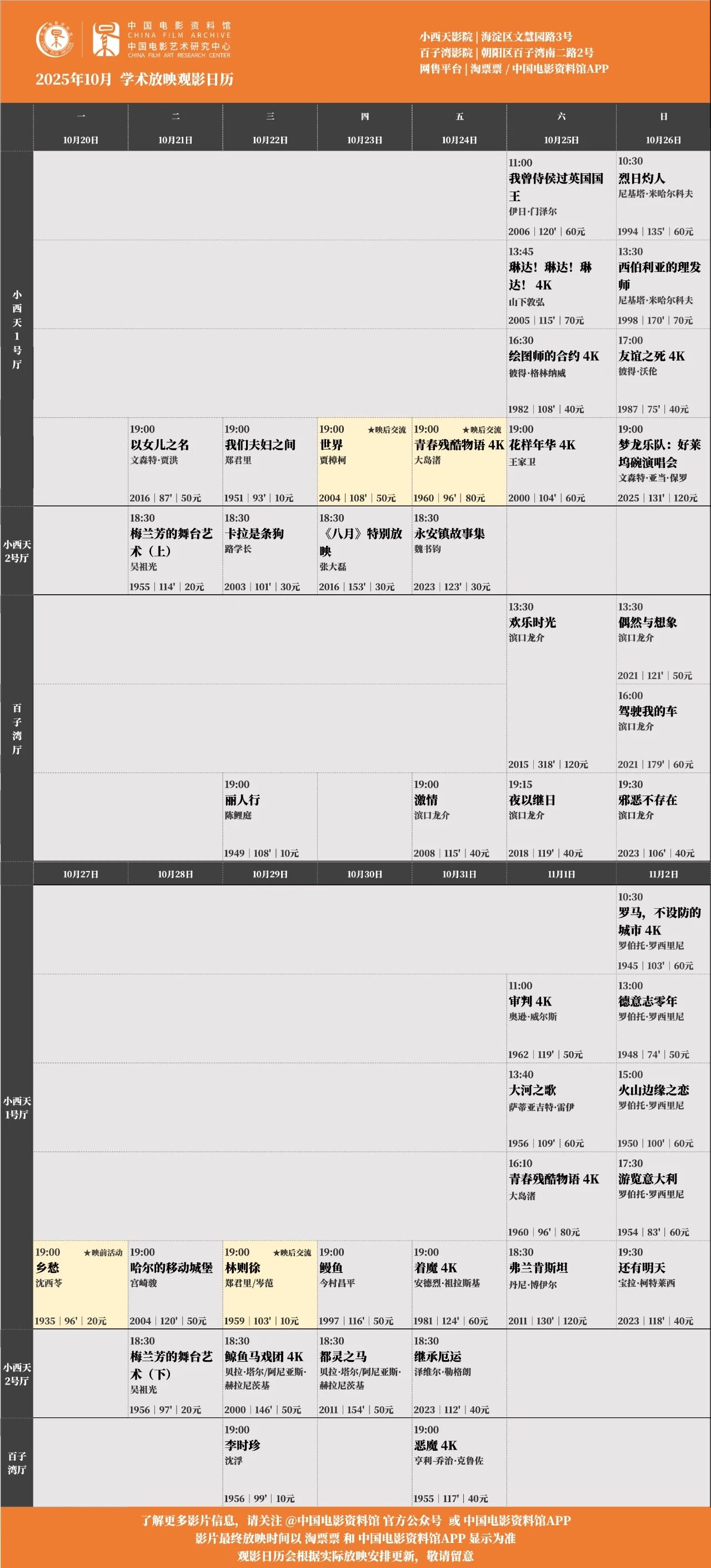 所有场次均可在淘票票、中国电影资料馆APP购票,具体排片见末图,祝大家观影愉快。❤️