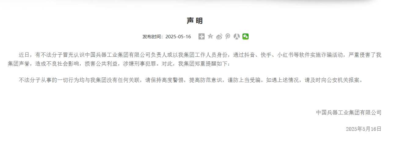 兵器工业集团声明:不法分子从事的一切行为均与我集团没有任何关联升富策略兵器工业集团声明:不法分子从事的一切行为均与我集团没有任何关联